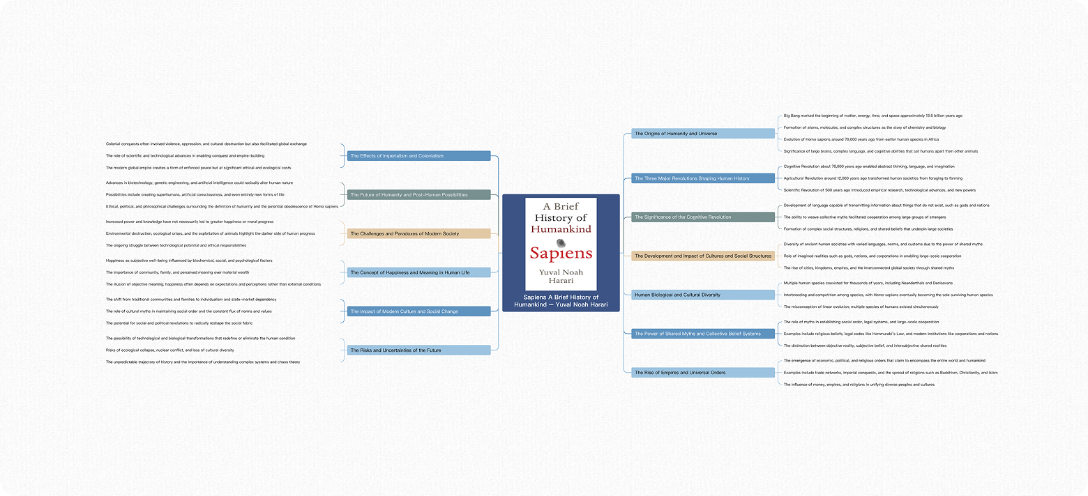 Comprende rápidamente Sapiens extrayendo ideas históricas clave, eventos principales y la evolución de la sociedad.