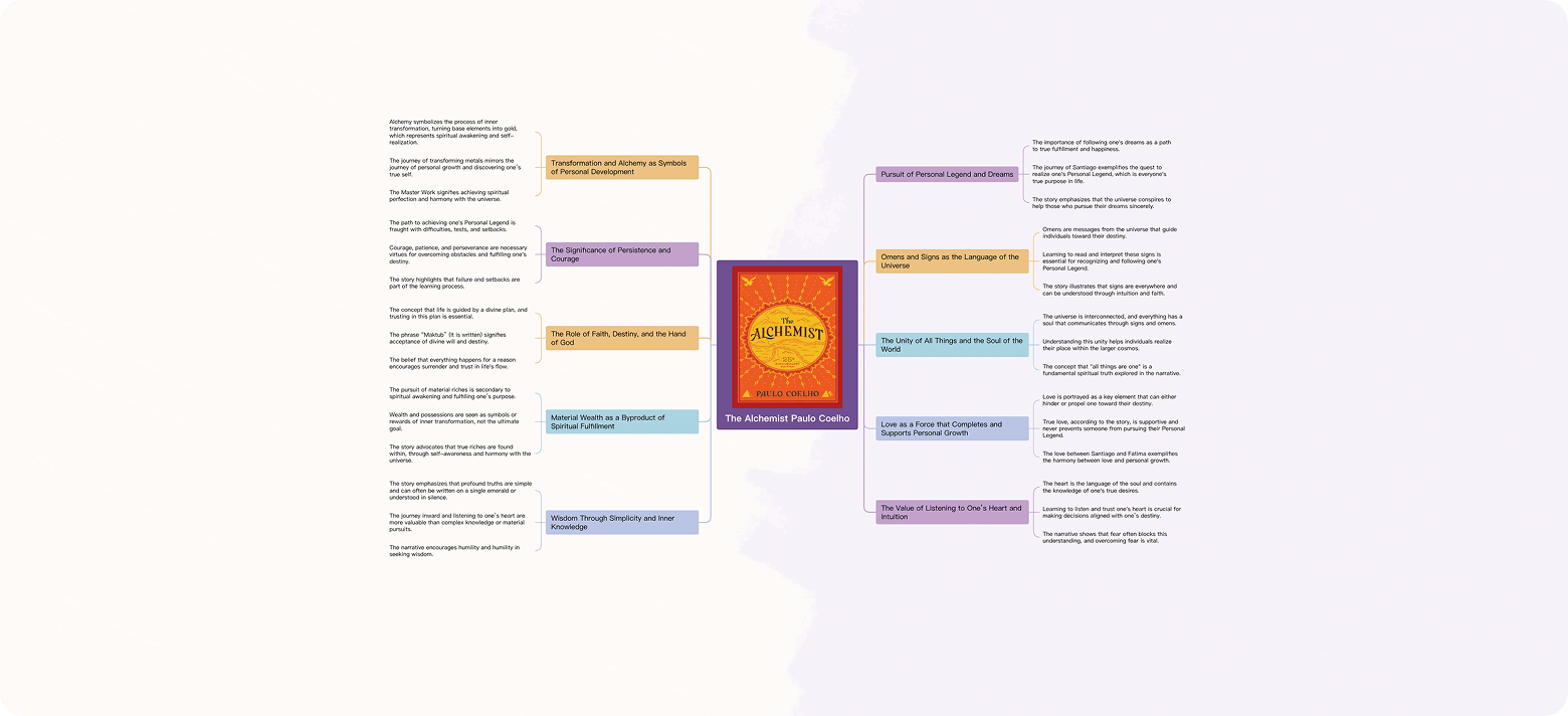 Resume El alquimista destacando los puntos esenciales de la trama, los viajes de los personajes y los temas principales sobre el destino y la inspiración.