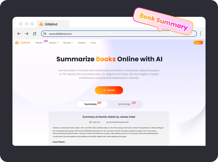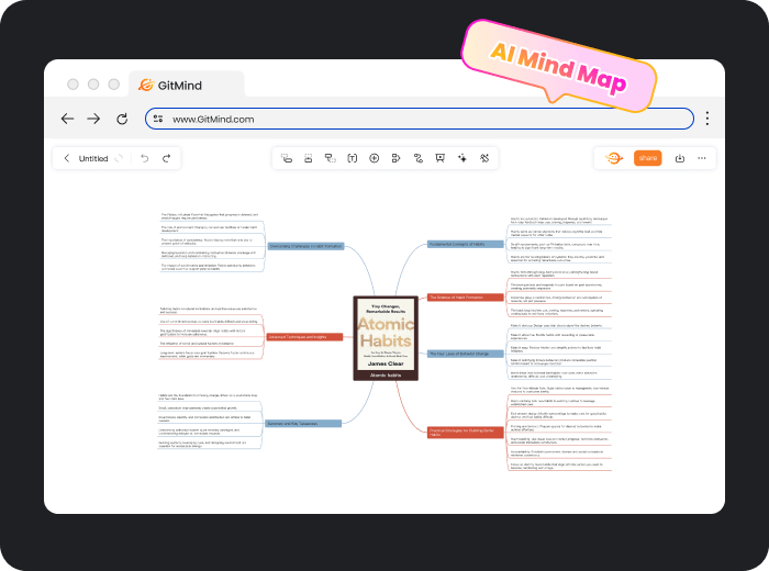 El Generador de Resúmenes con IA de GitMind aumenta tu productividad. Sube tu libro y generará rápidamente un mapa mental con un resumen claro y estructurado.